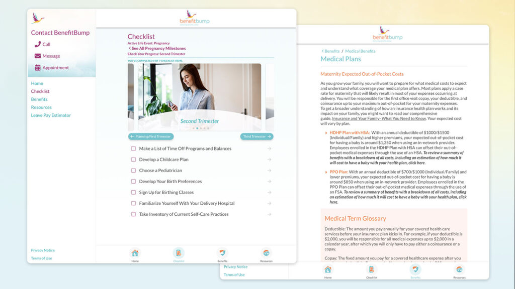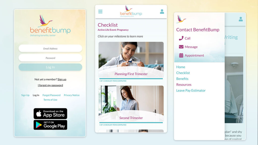 The result was a comprehensive, flexible platform that evolved seamlessly from concept to reality. The prototype helped Benefit Bump secure interest from employers, while the full app empowered users to navigate their benefits with clarity—supporting everything from scheduling consultations to submitting FMLA forms. The final product positioned Benefit Bump as a trusted resource for working parents and a valuable partner for HR teams.