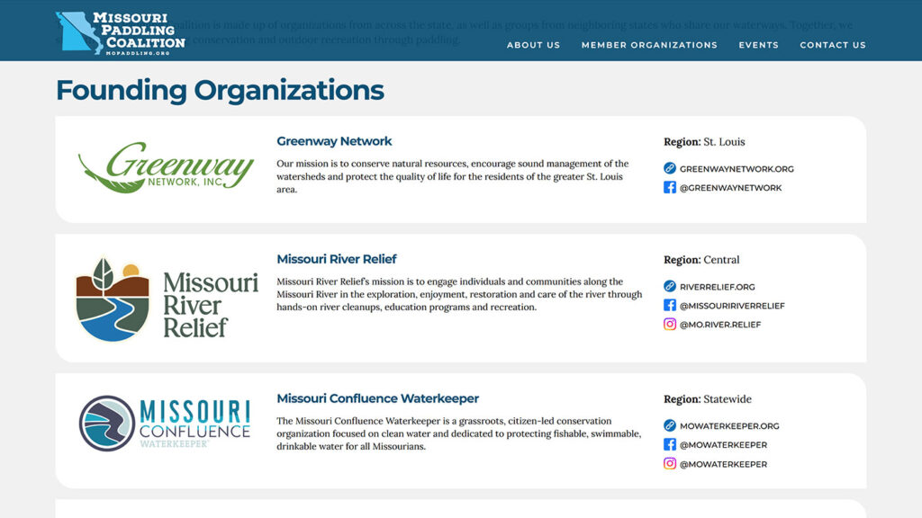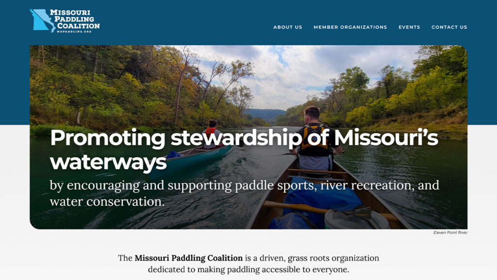 The Missouri Paddling Coalition was formed to bring together paddling and water conservation groups from across the state, creating a unified voice for Missouri’s rivers. As a newly established organization, they needed a clear identity and an online presence that could connect member groups, promote events, and share resources with paddlers and conservationists alike.