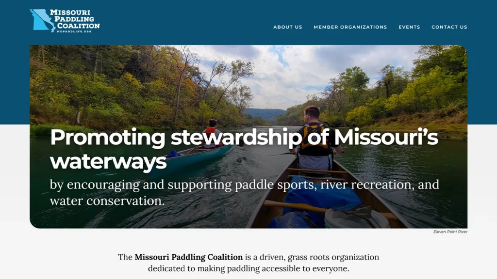 The Missouri Paddling Coalition was formed to bring together paddling and water conservation groups from across the state, creating a unified voice for Missouri’s rivers. As a newly established organization, they needed a clear identity and an online presence that could connect member groups, promote events, and share resources with paddlers and conservationists alike.