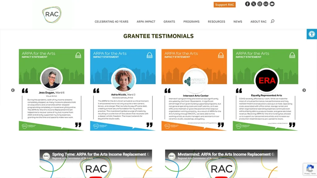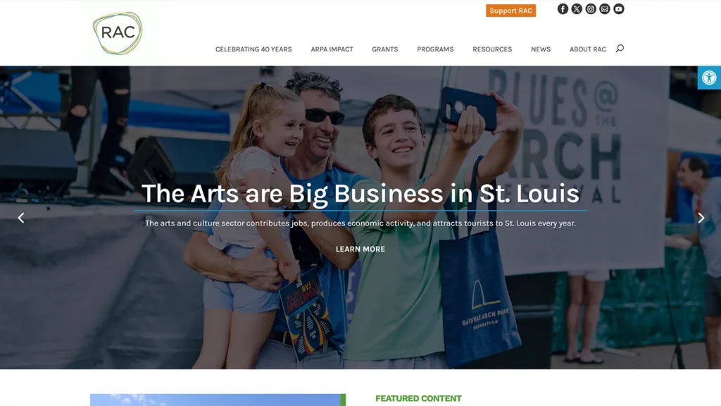 The Regional Arts Commission of St. Louis (RAC) serves as the leading public funder and advocate for the arts in the region. Working in collaboration with Cannonball, we set out to modernize RAC’s digital presence and better represent its role as a cultural connector. The new website needed to reflect the breadth of RAC’s work—from funding and public art initiatives to community programs—while remaining easy to manage internally.